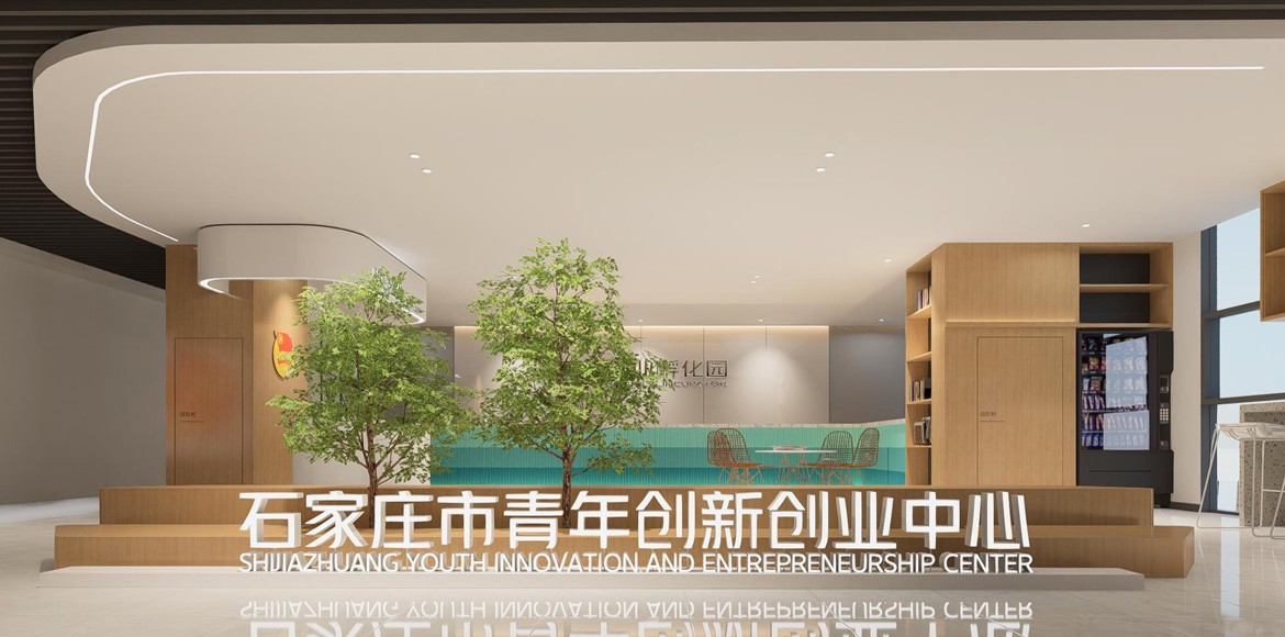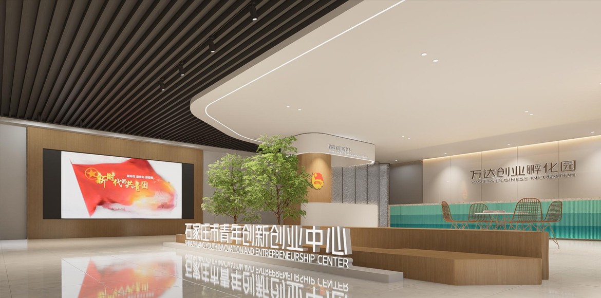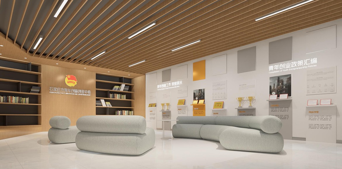 石家庄团市委展厅,主要设计范围为接待空间和办公室,接待空间采用沉稳木色与渐变亚克力相结合,整体风格简约明亮.