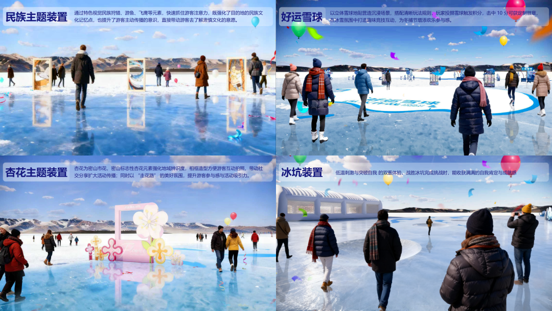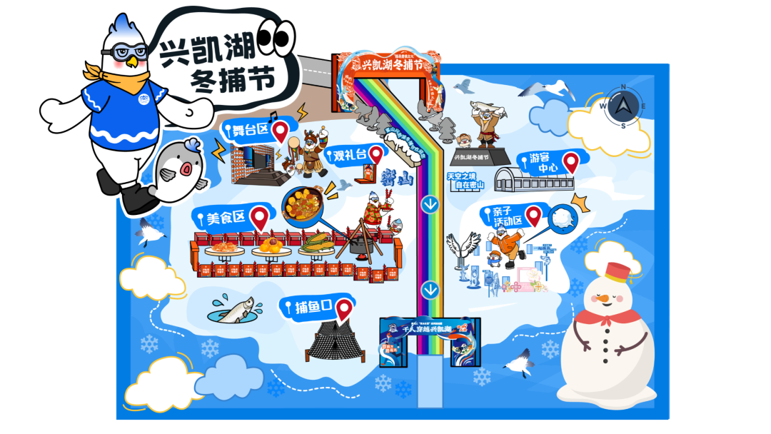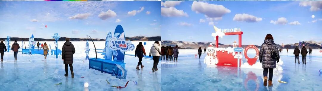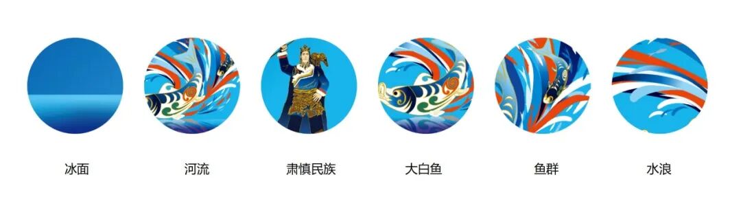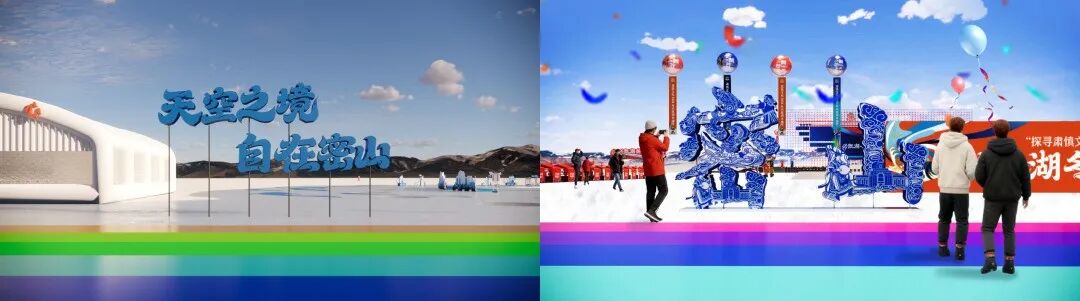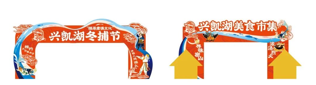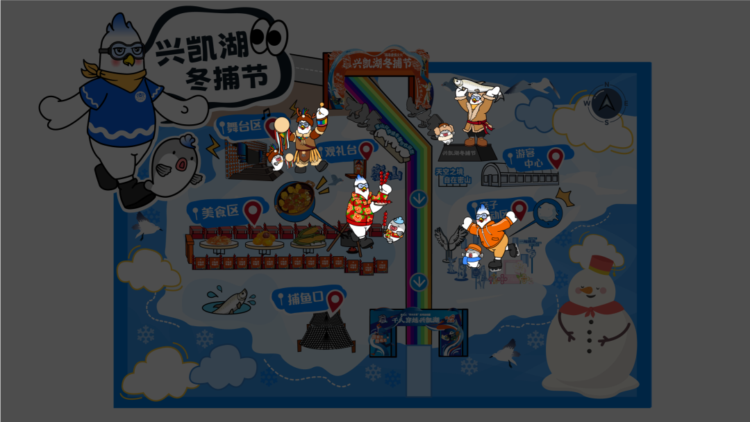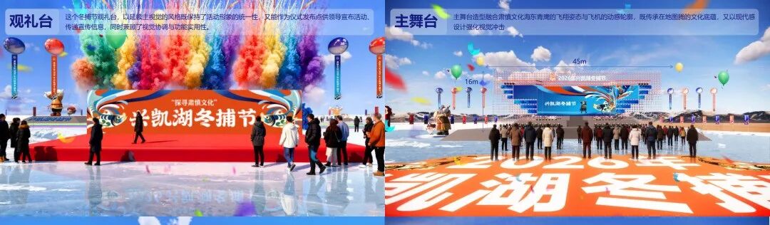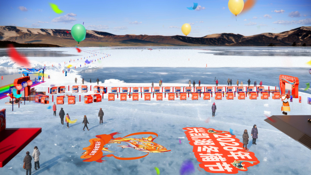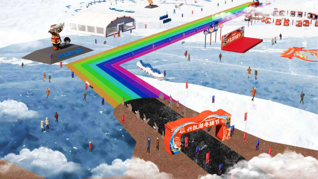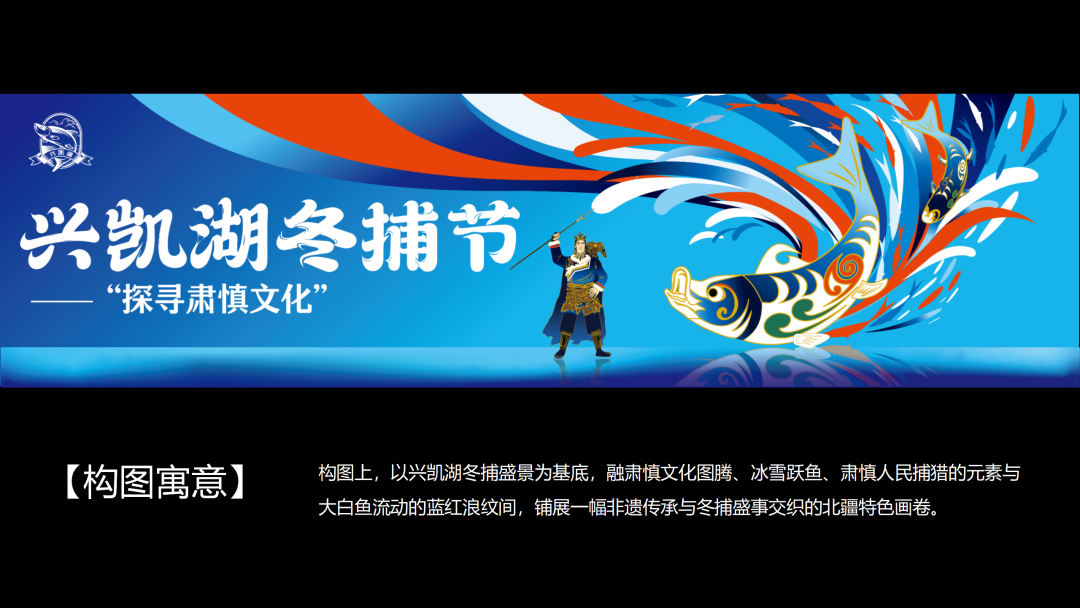 在冬捕节主视觉上,设际邹创新集团以冬捕盛景为底,融入肃慎图腾、冰雪鱼群、古人捕猎场景与大白鱼蓝红浪纹,凸显 “大白鱼之乡” 特色和肃慎文化底蕴。