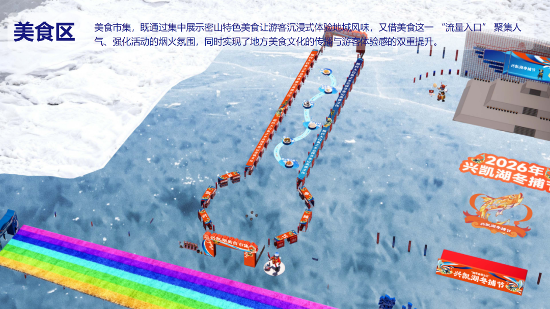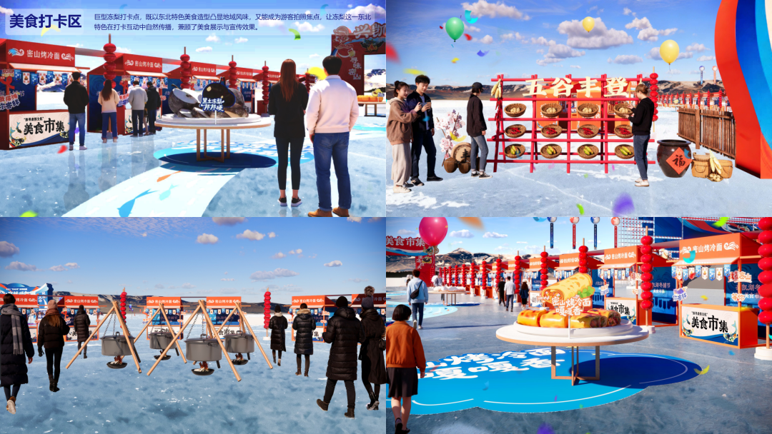 美食市集 80 个统一摊位汇集湖鱼美食、东北特色小吃,设有试吃区与巨型美食打卡装置,还融入非遗产品与俄罗斯特产,兼具风味体验与商贸功能。